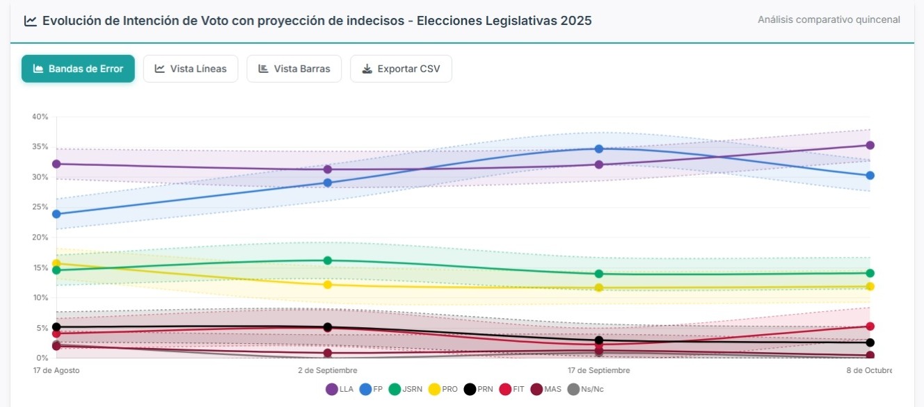El estudio indica que LLA alcanza el 35,3% de intención de voto, lo que representa un incremento de 3,2 puntos respecto a septiembre. El crecimiento se explica por la captación del 35% de los votantes indecisos, lo que marca una recuperación del voto libertario tras los escándalos del mes pasado.